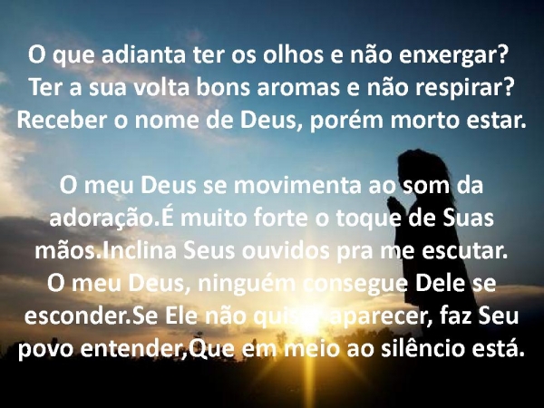 - O que adianta ter os olhos e não enxergar? Ter a sua volta bons aromas e não respirar?Receber o nome de Deus, porém morto estar.O meu Deus se movimenta ao som da adoração.É muito forte o toque de Suas mãos.Inclina Seus ouvidos pra me escutar.O meu Deus, ninguém consegue Dele se esconder.Se Ele não quiser aparecer, faz Seu povo entender,Que em meio ao silêncio está.