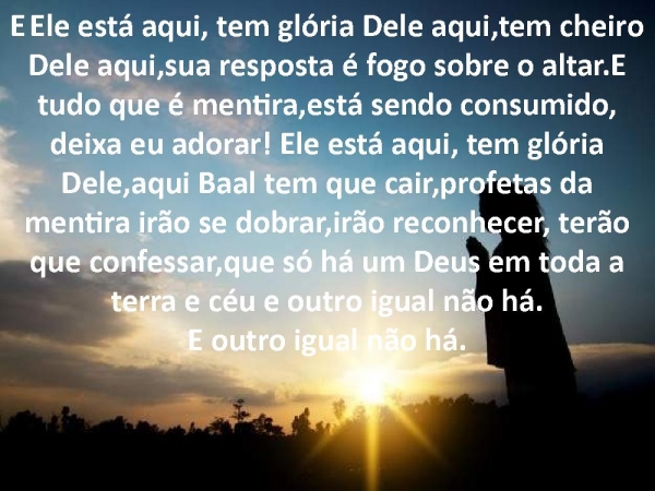 - E Ele está aqui, tem glória Dele aqui,tem cheiro Dele aqui,sua resposta é fogo sobre o altar.E tudo que é mentira,está sendo consumido, deixa eu adorar! Ele está aqui, tem glória Dele,aqui Baal tem que cair,profetas da mentira irão se dobrar,irão reconhecer, terão que confessar,que só há um Deus em toda a terra e céu e outro igual não há.E outro igual não há ( 8 vezes).
