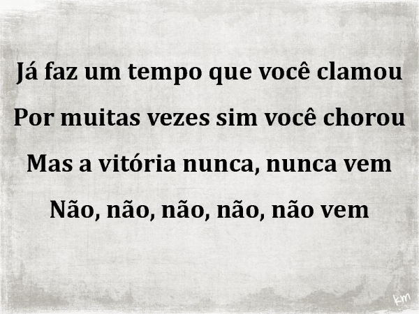 - Já faz um tempo que você clamouPor muitas vezes sim você chorouMas a vitória nunca, nunca vemNão, não, não, não, não vem