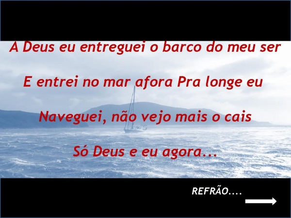 - A Deus eu entreguei o barco do meu serE entrei no mar afora Pra longe eu Naveguei, não vejo mais o caisSó Deus e eu agora...REFRÃO....