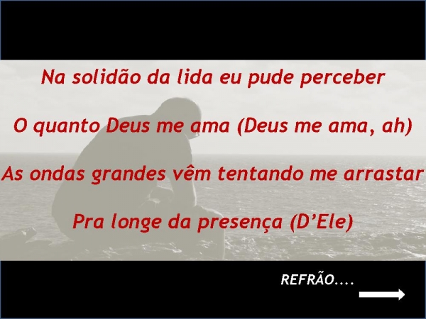 - Na solidão da lida eu pude perceberO quanto Deus me ama (Deus me ama, ah)As ondas grandes vêm tentando me arrastarPra longe da presença (D’Ele)REFRÃO....