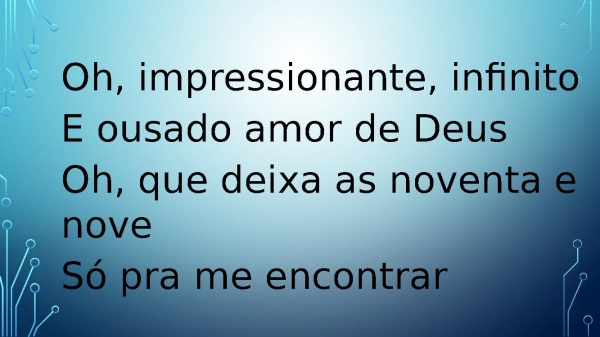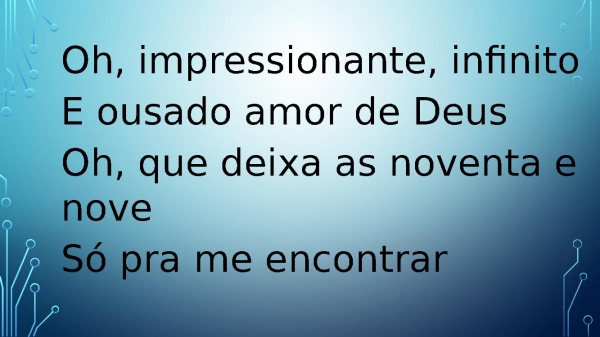 - Oh, impressionante, infinitoE ousado amor de DeusOh, que deixa as noventa e noveSó pra me encontrar