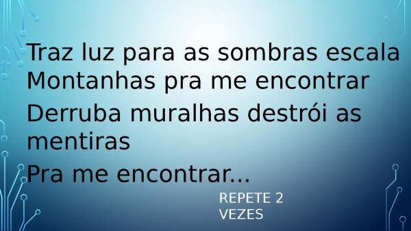 - Traz luz para as sombras escala Montanhas pra me encontrarDerruba muralhas destrói as mentirasPra me encontrar...REPETE 2 VEZES