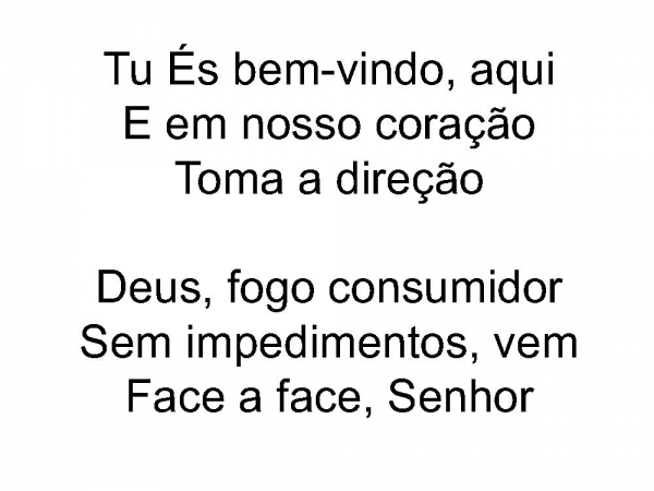 - Tu És bem-vindo, aquiE em nosso coraçãoToma a direçãoDeus, fogo consumidorSem impedimentos, vemFace a face, Senhor