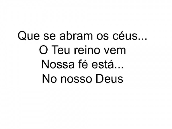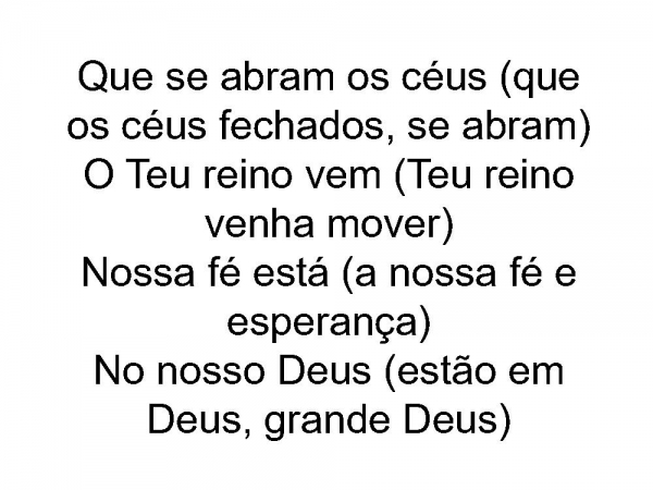 - Que se abram os céus (que os céus fechados, se abram)O Teu reino vem (Teu reino venha mover)Nossa fé está (a nossa fé e esperança)No nosso Deus (estão em Deus, grande Deus)