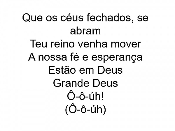 - Que os céus fechados, se abramTeu reino venha moverA nossa fé e esperançaEstão em DeusGrande DeusÔ-ô-úh!(Ô-ô-úh)