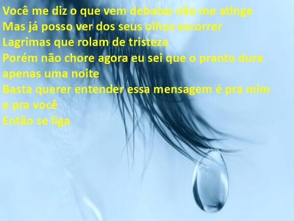 - Você me diz o que vem debaixo não me atingeMas já posso ver dos seus olhos escorrerLagrimas que rolam de tristezaPorém não chore agora eu sei que o pranto dura apenas uma noiteBasta querer entender essa mensagem é pra mim e pra vocêEntão se liga
