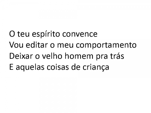 - O teu espírito convenceVou editar o meu comportamentoDeixar o velho homem pra trásE aquelas coisas de criança