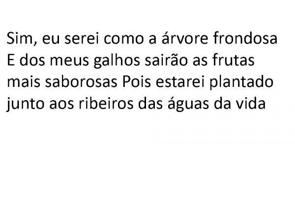 - Sim, eu serei como a árvore frondosa E dos meus galhos sairão as frutas mais saborosas Pois estarei plantado junto aos ribeiros das águas da vida