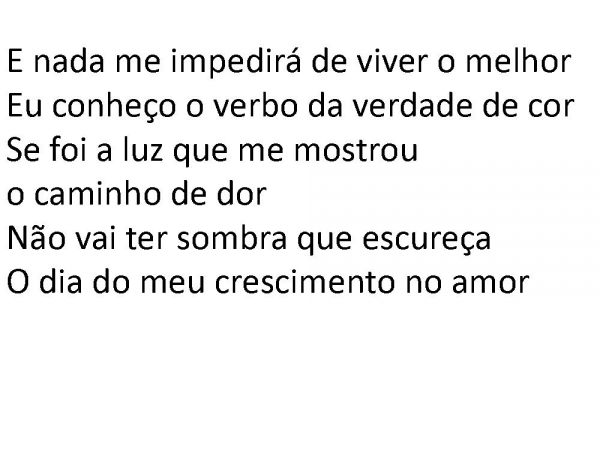 - E nada me impedirá de viver o melhor Eu conheço o verbo da verdade de cor Se foi a luz que me mostrou o caminho de dor Não vai ter sombra que escureçaO dia do meu crescimento no amor
