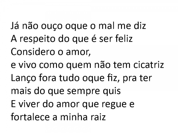 - Já não ouço oque o mal me dizA respeito do que é ser felizConsidero o amor, e vivo como quem não tem cicatrizLanço fora tudo oque fiz, pra ter mais do que sempre quisE viver do amor que regue e fortalece a minha raiz