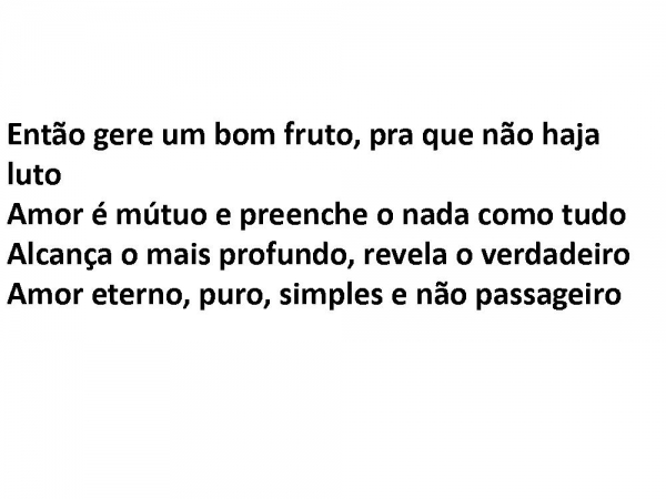 - Então gere um bom fruto, pra que não haja lutoAmor é mútuo e preenche o nada como tudoAlcança o mais profundo, revela o verdadeiroAmor eterno, puro, simples e não passageiro