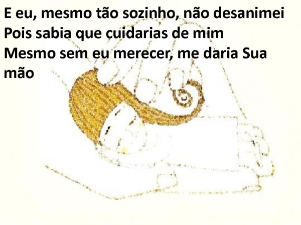 - E eu, mesmo tão sozinho, não desanimeiPois sabia que cuidarias de mimMesmo sem eu merecer, me daria Sua mão