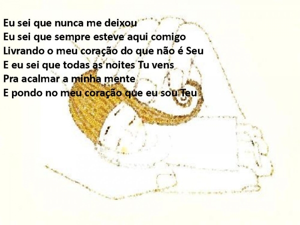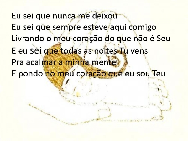 - Eu sei que nunca me deixouEu sei que sempre esteve aqui comigoLivrando o meu coração do que não é SeuE eu sei que todas as noites Tu vensPra acalmar a minha menteE pondo no meu coração que eu sou Teu