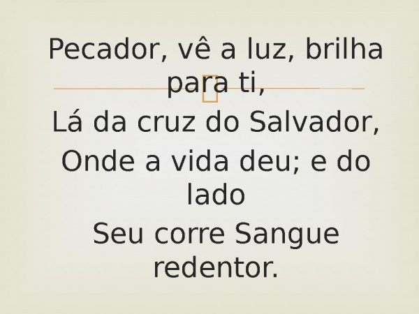 - Pecador, vê a luz, brilha para ti,Lá da cruz do Salvador,Onde a vida deu; e do ladoSeu corre Sangue redentor.