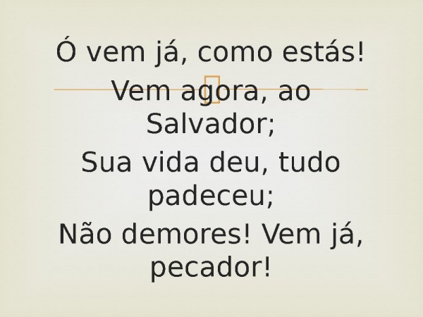 - Ó vem já, como estás!Vem agora, ao Salvador;Sua vida deu, tudo padeceu;Não demores! Vem já, pecador!