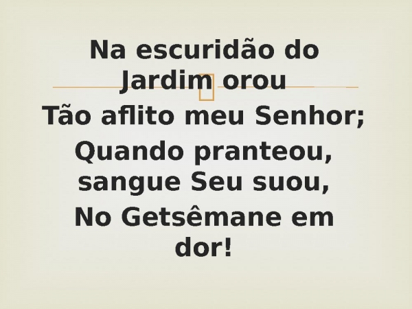 - Na escuridão do Jardim orouTão aflito meu Senhor;Quando pranteou, sangue Seu suou,No Getsêmane em dor!