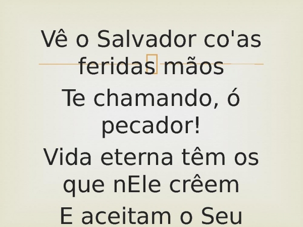 - Vê o Salvador co'as feridas mãosTe chamando, ó pecador!Vida eterna têm os que nEle crêemE aceitam o Seu amor.