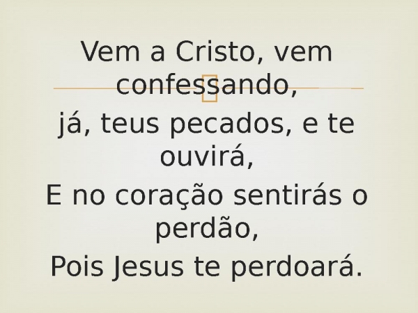 - Vem a Cristo, vem confessando,já, teus pecados, e te ouvirá,E no coração sentirás o perdão,Pois Jesus te perdoará.