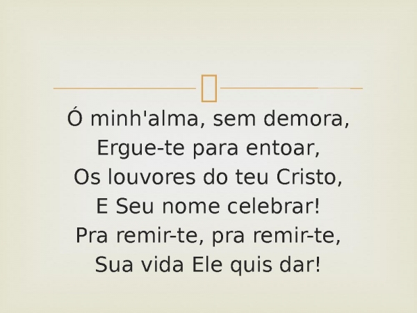 - Ó minh'alma, sem demora,Ergue-te para entoar,Os louvores do teu Cristo,E Seu nome celebrar!Pra remir-te, pra remir-te,Sua vida Ele quis dar!