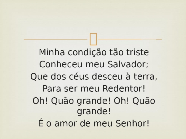 - Minha condição tão tristeConheceu meu Salvador;Que dos céus desceu à terra,Para ser meu Redentor!Oh! Quão grande! Oh! Quão grande!É o amor de meu Senhor!
