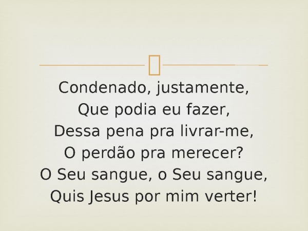 - Condenado, justamente,Que podia eu fazer,Dessa pena pra livrar-me,O perdão pra merecer?O Seu sangue, o Seu sangue,Quis Jesus por mim verter!