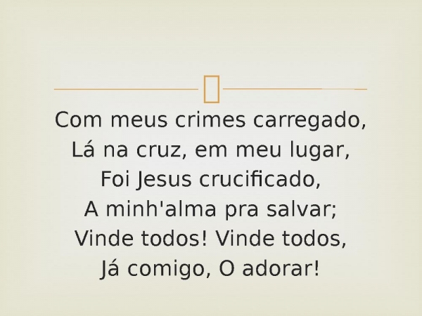 - Com meus crimes carregado,Lá na cruz, em meu lugar,Foi Jesus crucificado,A minh'alma pra salvar;Vinde todos! Vinde todos,Já comigo, O adorar!
