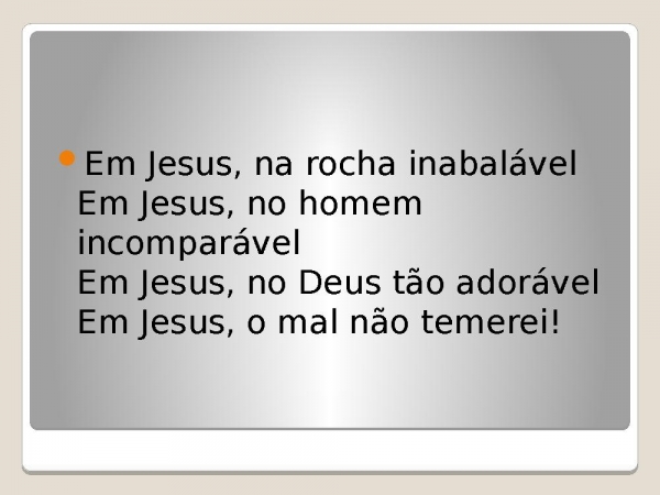 - Em Jesus, na rocha inabalávelEm Jesus, no homem incomparávelEm Jesus, no Deus tão adorávelEm Jesus, o mal não temerei!