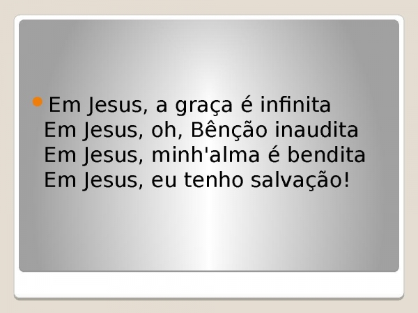 - Em Jesus, a graça é infinitaEm Jesus, oh, Bênção inauditaEm Jesus, minh'alma é benditaEm Jesus, eu tenho salvação!