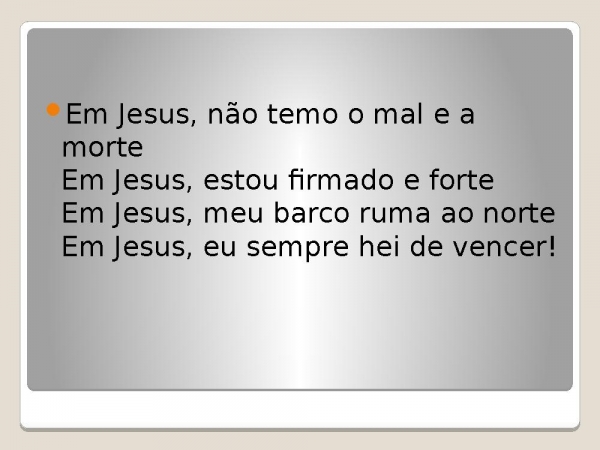 - Em Jesus, não temo o mal e a morteEm Jesus, estou firmado e forteEm Jesus, meu barco ruma ao norteEm Jesus, eu sempre hei de vencer!