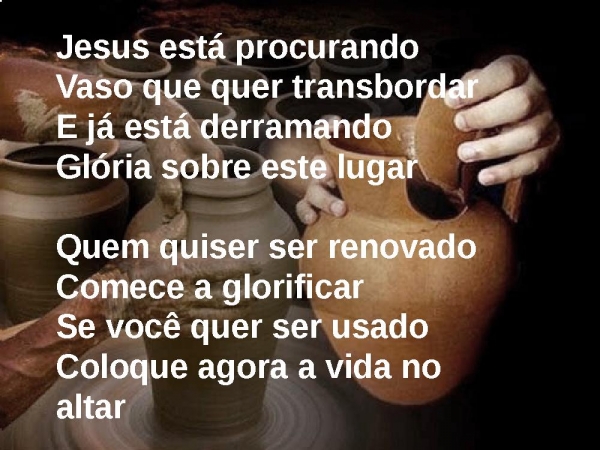 - Jesus está procurandoVaso que quer transbordarE já está derramandoGlória sobre este lugarQuem quiser ser renovadoComece a glorificarSe você quer ser usadoColoque agora a vida no altar