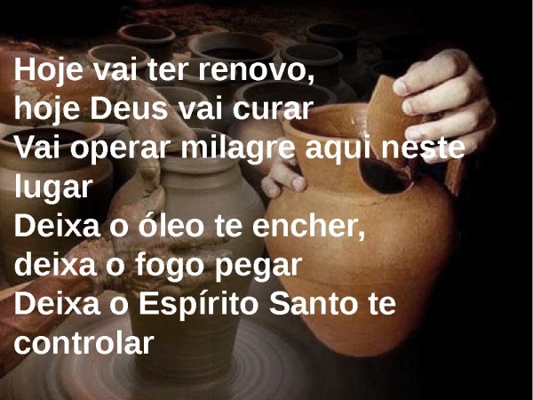 - Hoje vai ter renovo,hoje Deus vai curarVai operar milagre aqui neste lugarDeixa o óleo te encher,deixa o fogo pegarDeixa o Espírito Santo te controlar