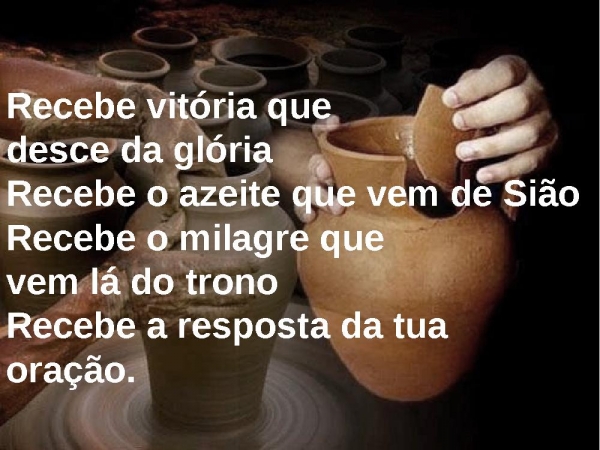 - Recebe vitória quedesce da glóriaRecebe o azeite que vem de SiãoRecebe o milagre que vem lá do tronoRecebe a resposta da tua oração.