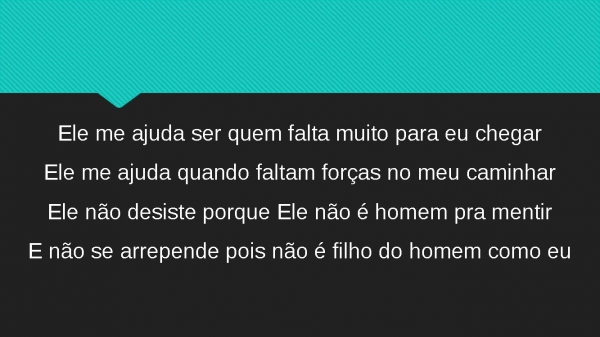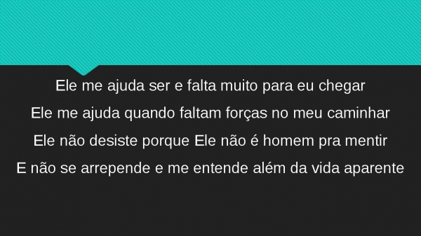 - Ele me ajuda ser e falta muito para eu chegarEle me ajuda quando faltam forças no meu caminharEle não desiste porque Ele não é homem pra mentirE não se arrepende e me entende além da vida aparente