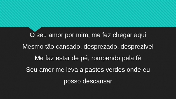 - O seu amor por mim, me fez chegar aquiMesmo tão cansado, desprezado, desprezívelMe faz estar de pé, rompendo pela féSeu amor me leva a pastos verdes onde eu posso descansar