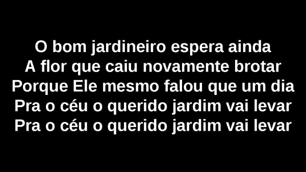 - O bom jardineiro espera aindaA flor que caiu novamente brotarPorque Ele mesmo falou que um diaPra o céu o querido jardim vai levarPra o céu o querido jardim vai levar