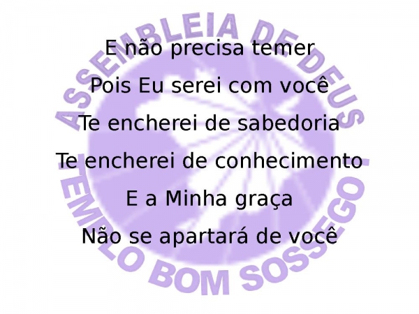 - E não precisa temerPois Eu serei com vocêTe encherei de sabedoriaTe encherei de conhecimentoE a Minha graçaNão se apartará de você
