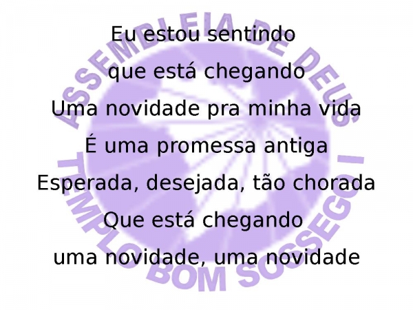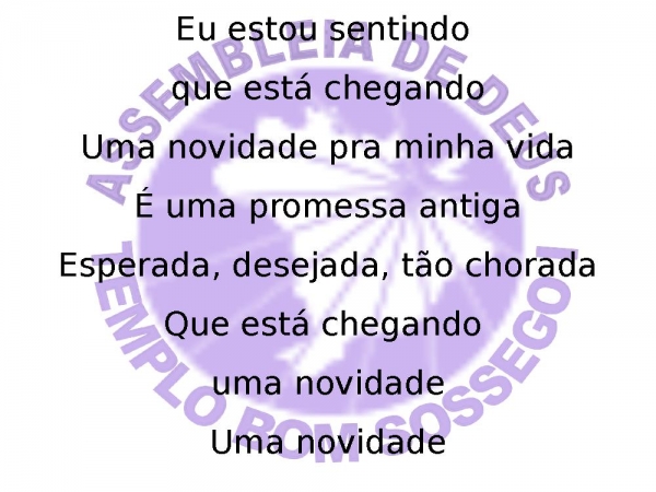 - Eu estou sentindo que está chegandoUma novidade pra minha vidaÉ uma promessa antigaEsperada, desejada, tão choradaQue está chegando uma novidade, uma novidade