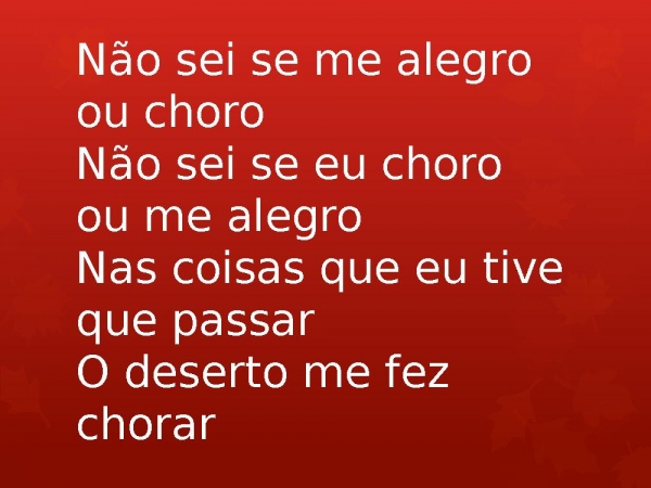 - Não sei se me alegro ou choroNão sei se eu choro ou me alegroNas coisas que eu tive que passarO deserto me fez chorar