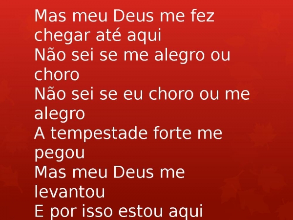 - Mas meu Deus me fez chegar até aquiNão sei se me alegro ou choroNão sei se eu choro ou me alegroA tempestade forte me pegouMas meu Deus me levantouE por isso estou aqui
