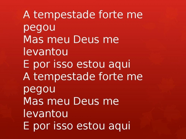- A tempestade forte me pegouMas meu Deus me levantouE por isso estou aquiA tempestade forte me pegouMas meu Deus me levantouE por isso estou aqui