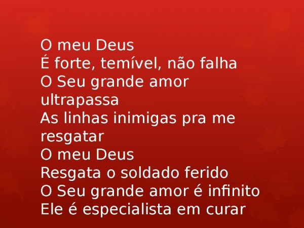 - O meu DeusÉ forte, temível, não falhaO Seu grande amor ultrapassaAs linhas inimigas pra me resgatarO meu DeusResgata o soldado feridoO Seu grande amor é infinitoEle é especialista em curar