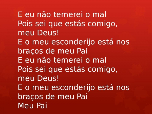 - E eu não temerei o malPois sei que estás comigo, meu Deus!E o meu esconderijo está nos braços de meu PaiE eu não temerei o malPois sei que estás comigo, meu Deus!E o meu esconderijo está nos braços de meu PaiMeu Pai
