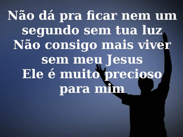 - Não dá pra ficar nem um segundo sem tua luzNão consigo mais viver sem meu JesusEle é muito precioso para mim