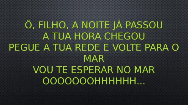 - Ô, filho, a noite já passouA tua hora chegouPegue a tua rede e volte para o marVou te esperar no marooooooohhhhhh...