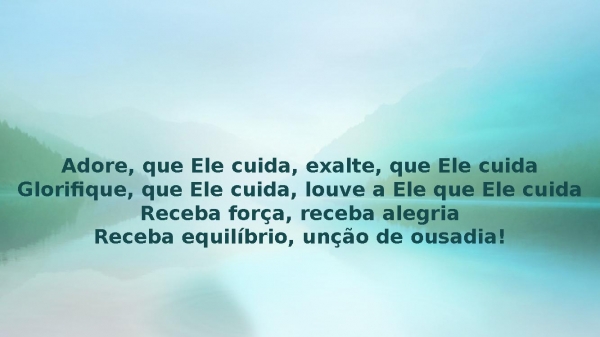 - Adore, que Ele cuida, exalte, que Ele cuidaGlorifique, que Ele cuida, louve a Ele que Ele cuidaReceba força, receba alegriaReceba equilíbrio, unção de ousadia!
