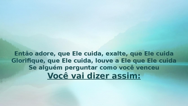 - Então adore, que Ele cuida, exalte, que Ele cuidaGlorifique, que Ele cuida, louve a Ele que Ele cuidaSe alguém perguntar como você venceuVocê vai dizer assim: