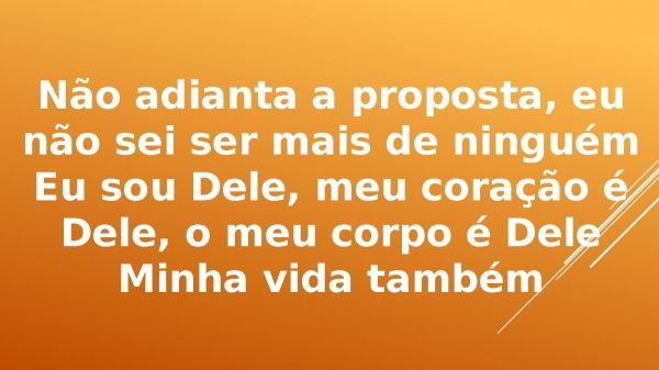 - Não adianta a proposta, eu não sei ser mais de ninguémEu sou Dele, meu coração é Dele, o meu corpo é DeleMinha vida também