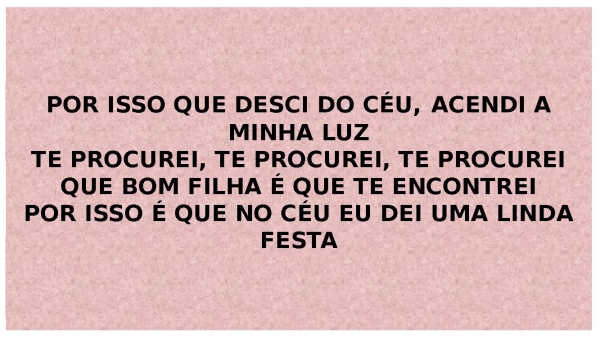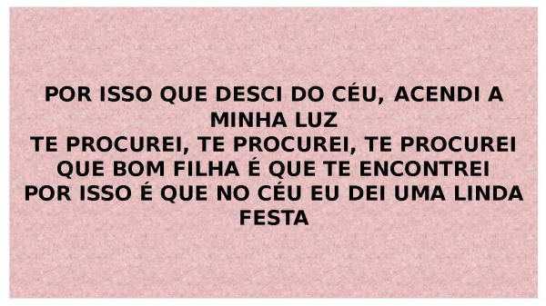 - POR ISSO QUE DESCI DO CÉU, ACENDI A MINHA LUZTE PROCUREI, TE PROCUREI, TE PROCUREIQUE BOM FILHA É QUE TE ENCONTREIPOR ISSO É QUE NO CÉU EU DEI UMA LINDA FESTA
