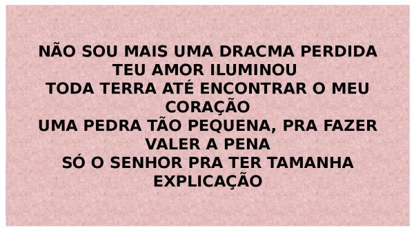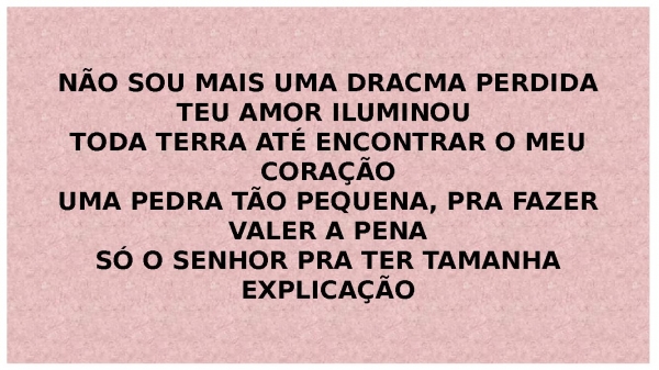 - NÃO SOU MAIS UMA DRACMA PERDIDATEU AMOR ILUMINOU TODA TERRA ATÉ ENCONTRAR O MEU CORAÇÃOUMA PEDRA TÃO PEQUENA, PRA FAZER VALER A PENASÓ O SENHOR PRA TER TAMANHA EXPLICAÇÃO